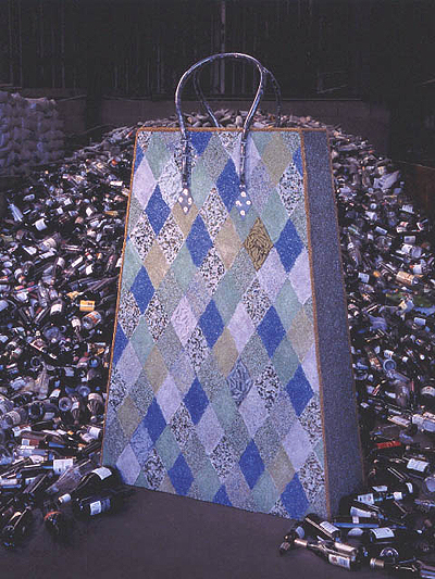 | PERSONAL BAGGAGE COLLECTION - EVENING BAG 2003 196 x 114 x 38 cm recycled, crushed glass, old wood, discarded upholstery piping, textile and leather scraps, plastic tubing, rivets, Unibond glass adhesive. Location: Cumbria Crushing and Recycling Ltd, Workington, Cumbria NFS |