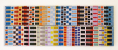![]() GRACE PIECE 2003 Cotton and conductive yarns, thermochromic ink, electronic components, and drive electronics 24" x 60" This color-change textile artwork was created for a private client by commission. This piece is hand woven and hand printed with over 150 hand mixed colors. It contains 64 unique color change areas. The expressive software for this piece is pseudo-random; it turns on 16 random color-change areas (pixels) at a time. |