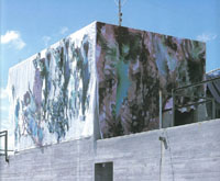 The six guest artists for In & Out represent various regions of fiber arts -- from 2-D, stitching, printing, and calligraphy, to unique constructions such as a 3-D-relief created with black vinyl trash bags. There was even a series of cubes constructed of sheer fabric attached to metal poles by the pond, which moved with every slight breeze and with the motions of passers-by. The artists also represented a range of ages, from 20s to 60s. Since the show was up for about one month, each artist was challenged to think about color-fastness and waterproofing, in addition to the interactive relationship between their works and the surrounding architecture and nature preserve.